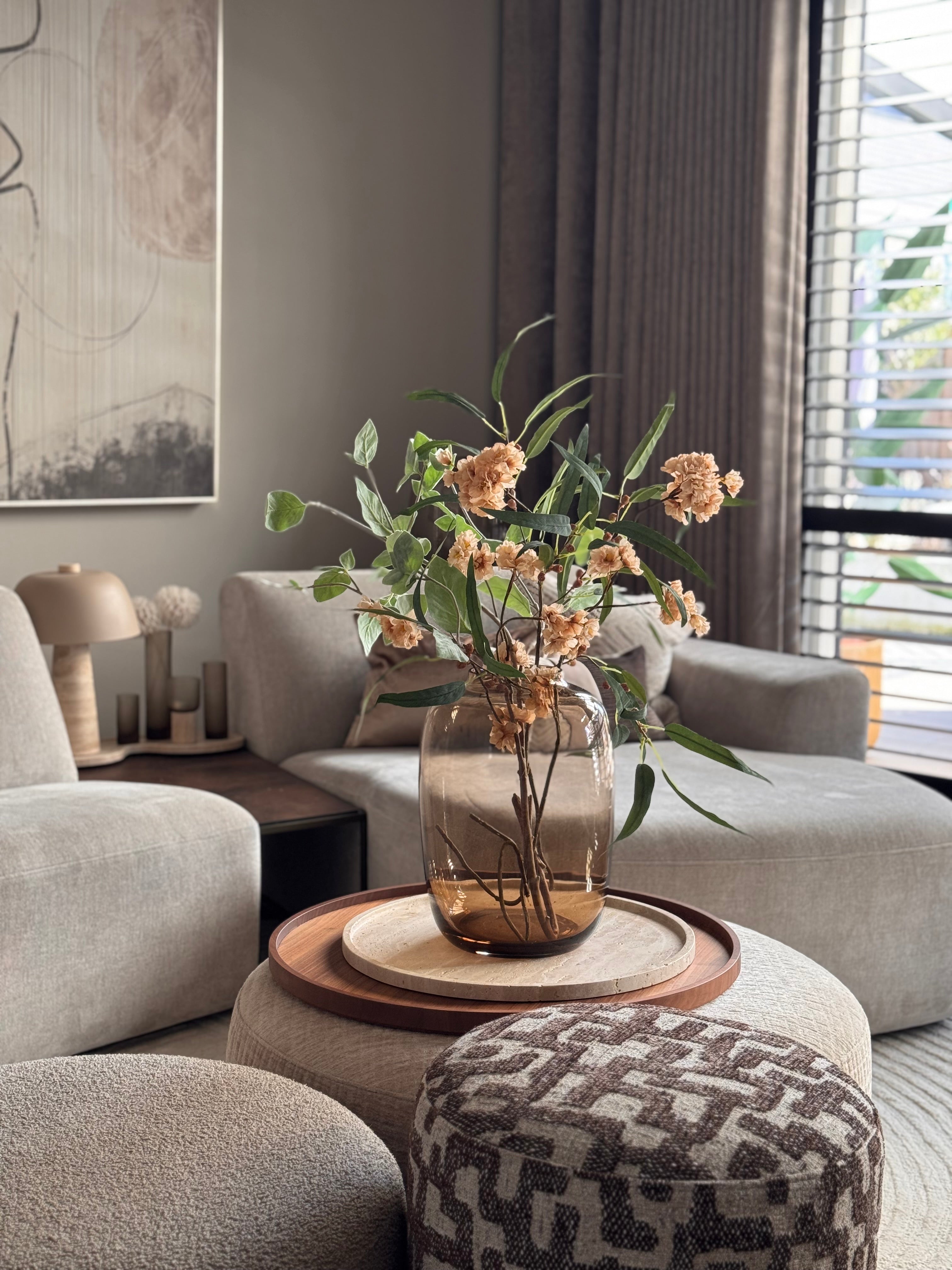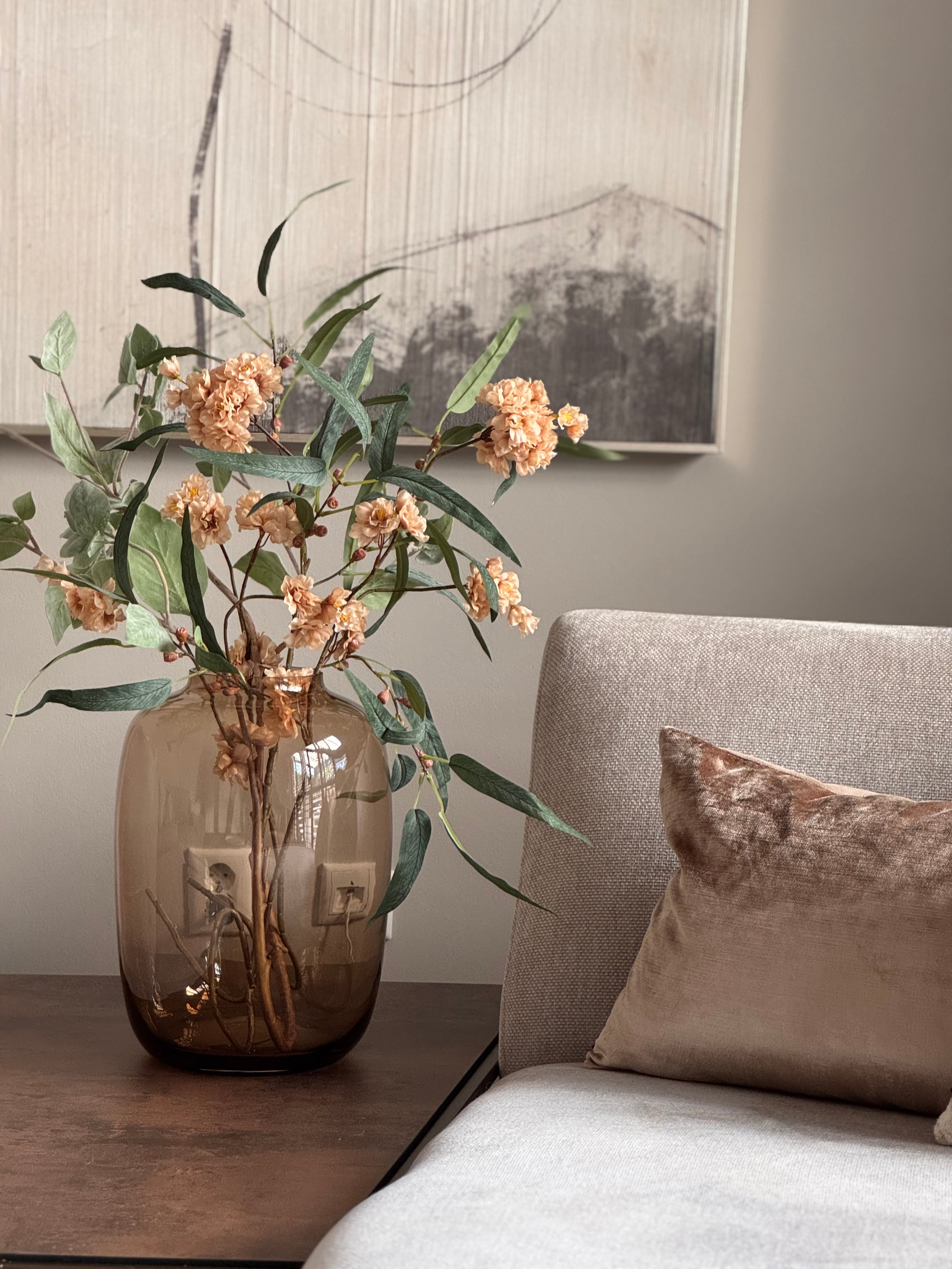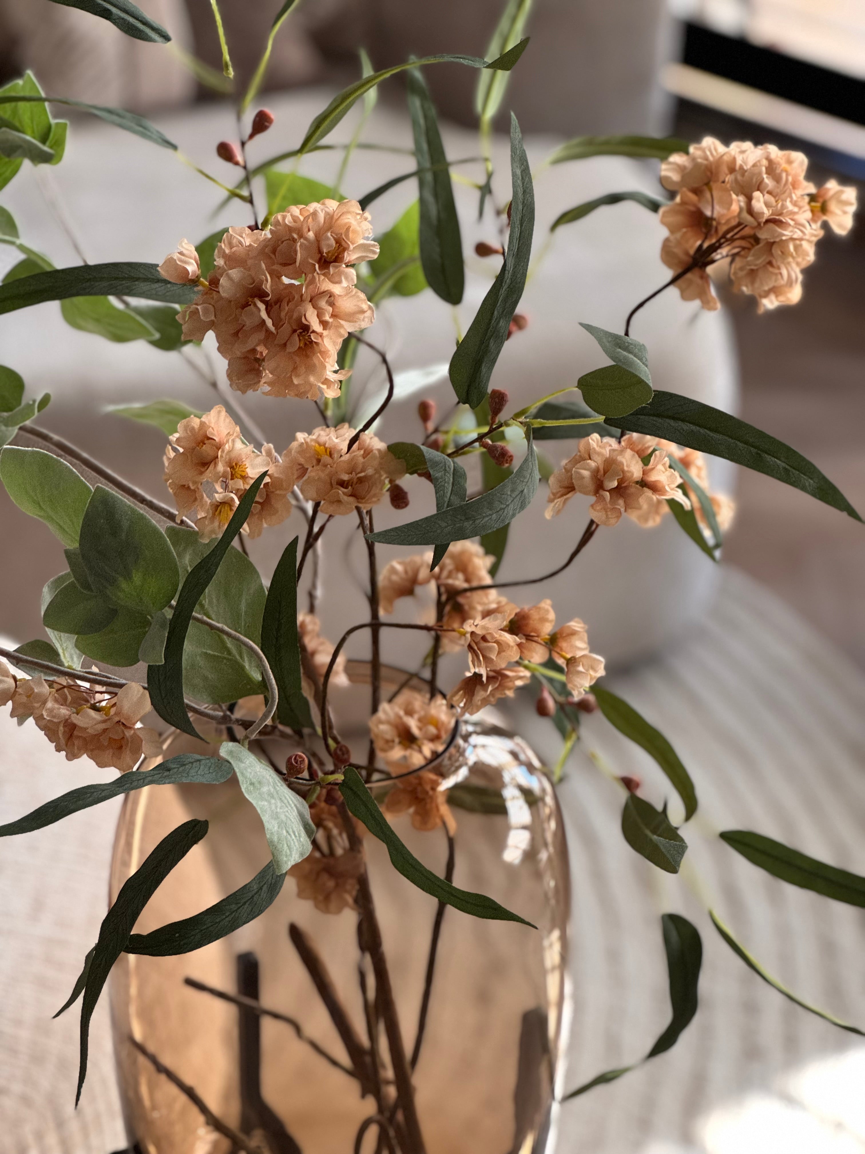 Een warm boeket in een zachte champagne kleur met fris groen. Subtiel, stijlvol en direct sfeerbepalend in elk interieur.