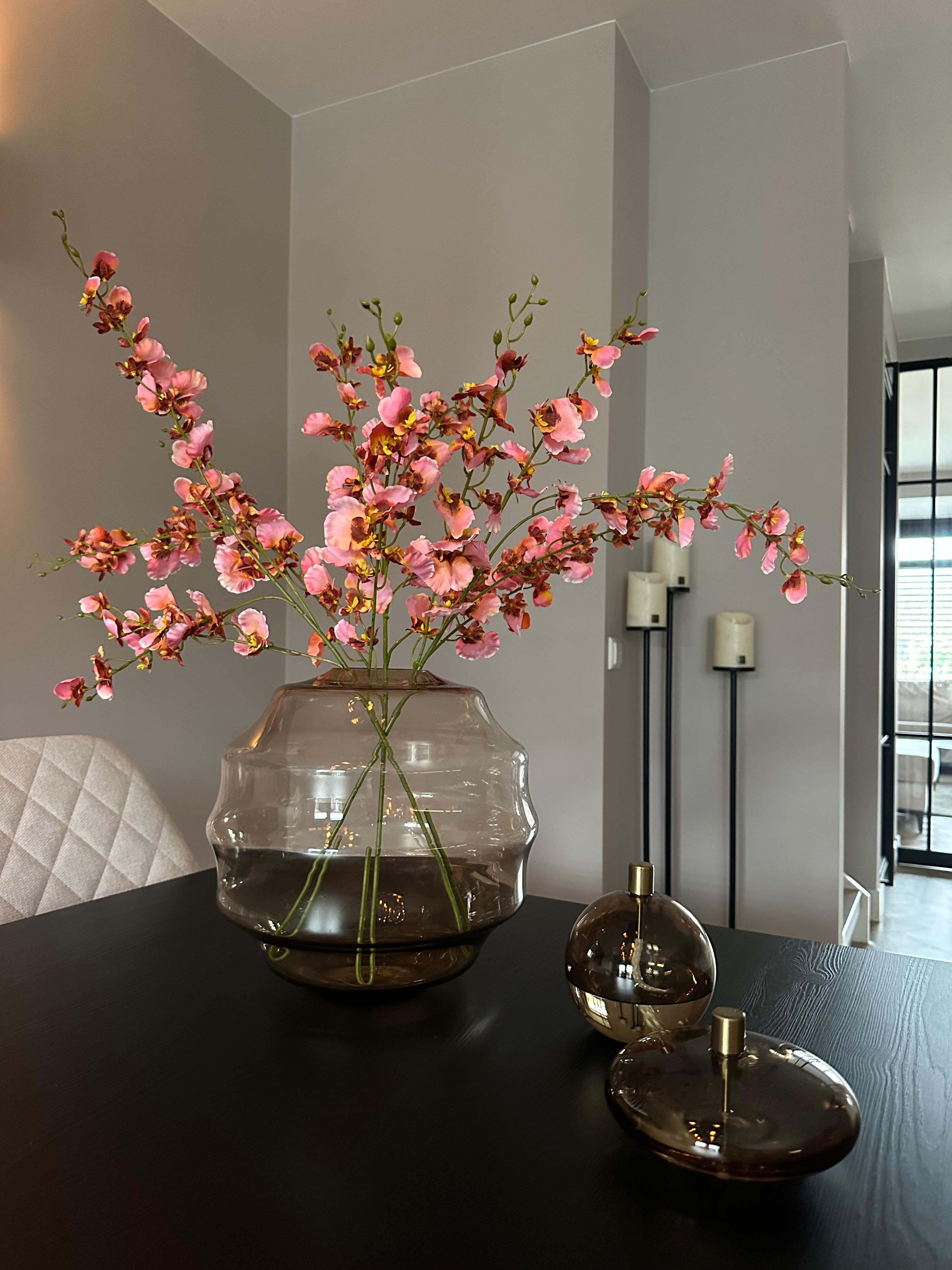 Een elegante, organisch gevormde vaas van amberkleurig glas. De vaas heeft een ronde, licht golvende vorm die het licht subtiel vangt en zorgt voor een verfijnde uitstraling. Door het amberkleurige glas blijven de stelen zichtbaar, wat een speels en natuurlijk effect geeft. Perfect als rustige blikvanger op een tafel of kast, zowel met bloemen als puur als decoratief object. De vaas ademt minimalisme, warmte en tijdloze elegantie. Klik hier voor onze kunstbloemen.
