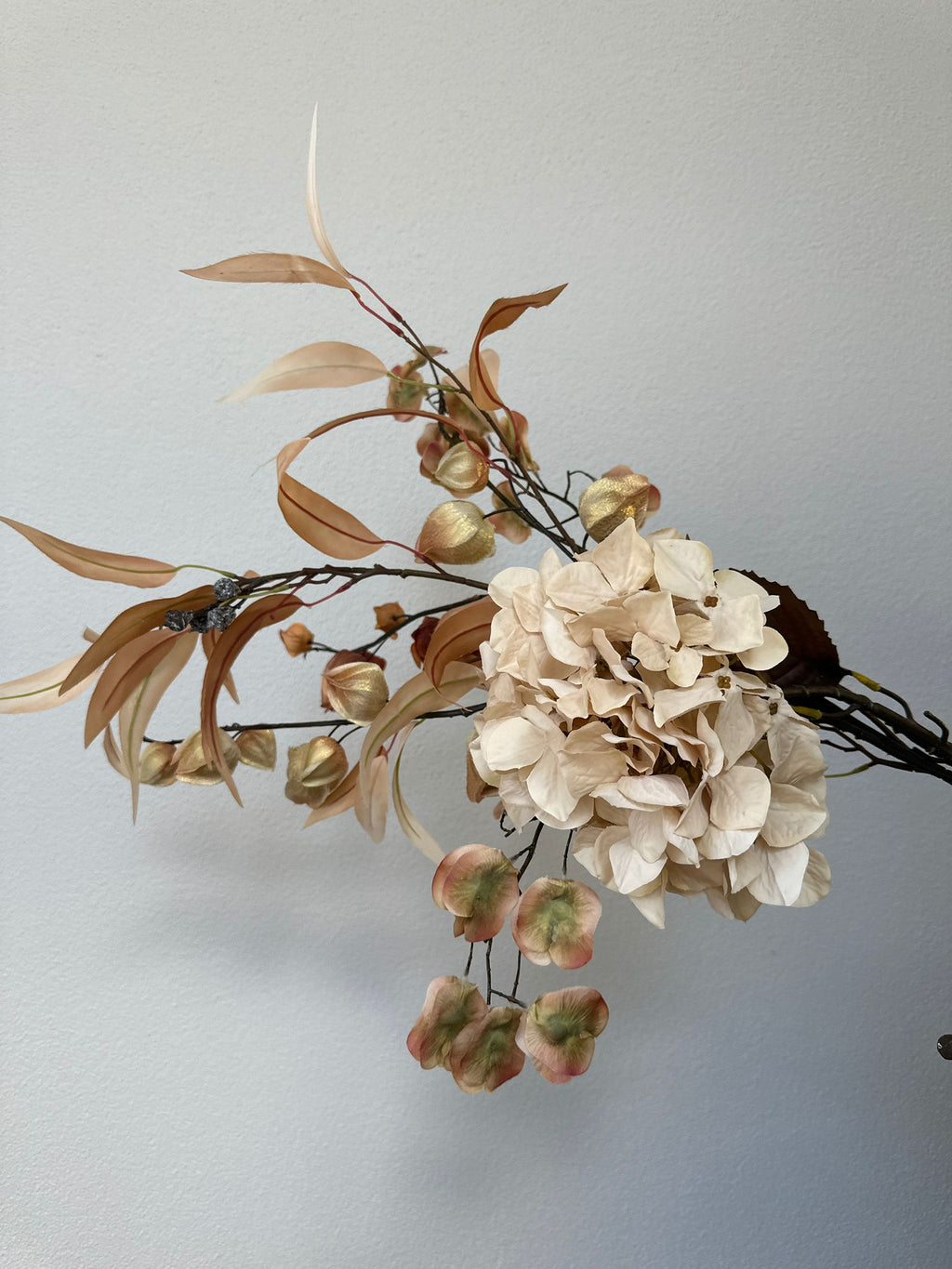 1x Chinese lampion champagne/1x Chinese lampion bruin/1x Hortensia cream/1x Eucalyptus bruin/1x Silver dollar spray